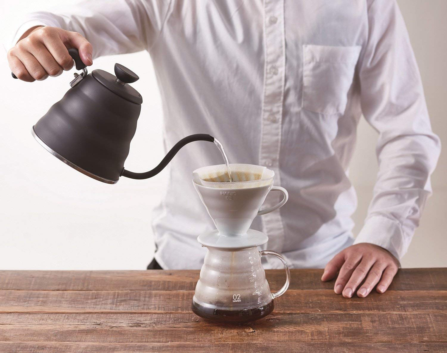 The Hario Buono goose-neck pour over kettle features a long slim spout, which allows easy control of the water flow. It also it has a heat proof handle offering a comfortable grip throughout the brewing process.